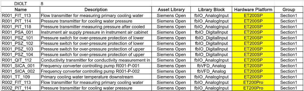 - Generation of PLC tags based on the details provided in the "Name" and "Description" columns and library block physical signals set and assign them to the respective IO modules with proper tag address and/or tag name.