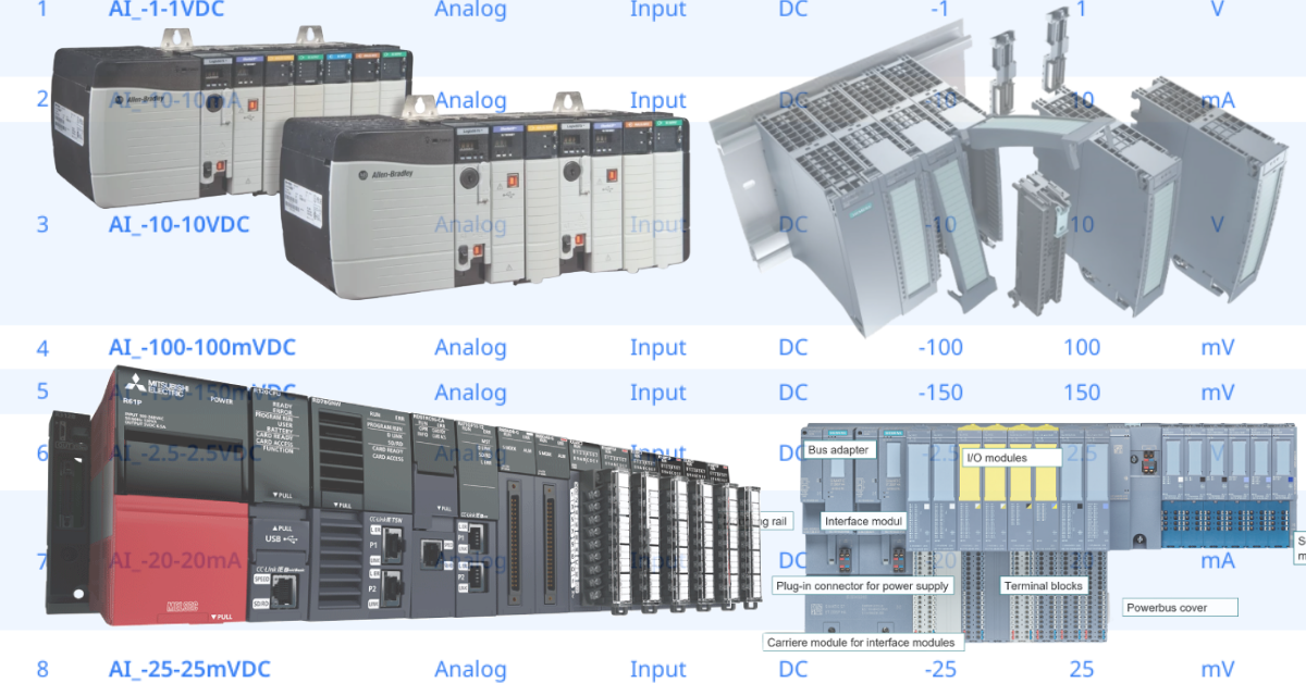 | 13 | AI_-50-50mVDC | Analog | Input | DC | -50 | 50 | mV | ET200MP | ET200SP | ET200M | ET200SPHA | ControlLogix | |