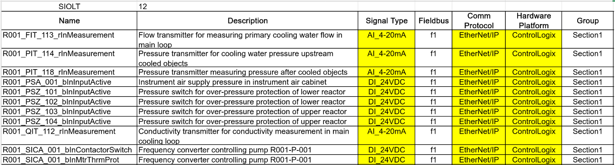 The table below gives an example signal IO list for the above use case example. To improve visibility, we have color-coded the signals belonging to each rack with green, blue, and yellow, respectively.
