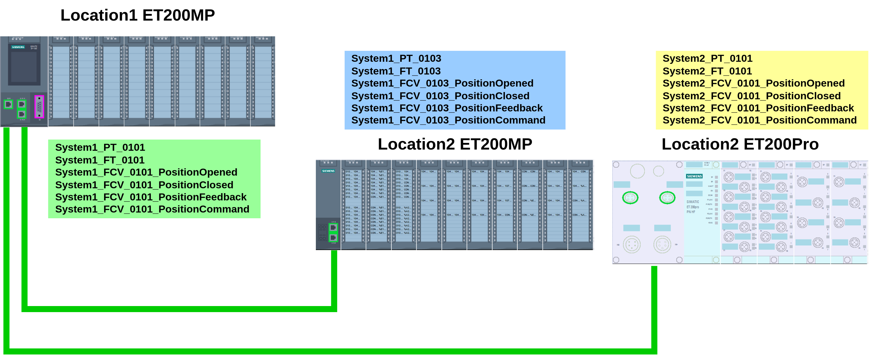 Let's take a simple use case example of the process system that has signals found in 2 separate locations: "Location1" and "Location2". It is required for the signals in "Location1" to be integrated with the "ET200MP" hardware platform. For "Location2" there are signals that need to be wired in the cabinet by using "ET200MP" and there are also signals that need to be integrated through cabinetless hardware "ET200Pro".