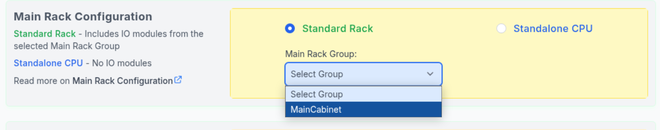 This means the CPU module will be installed in the rack containing IO modules needed to wire the signals that have selected Main Rack Group.