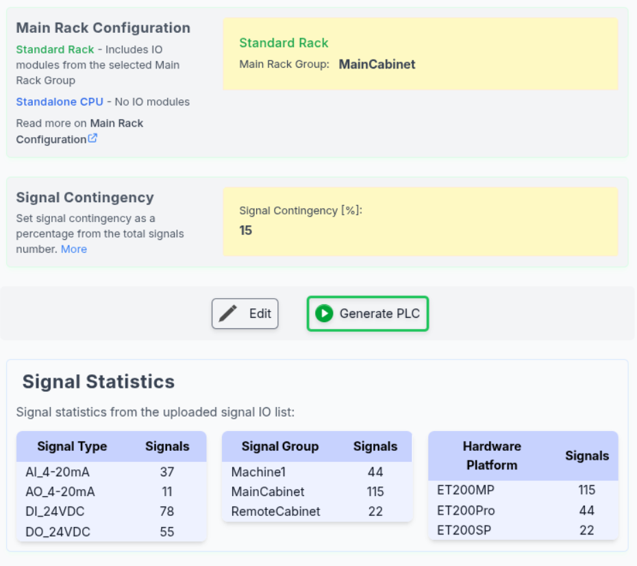 - Define percentage spare - applies for each signal type (DI, DO, AI, AO)