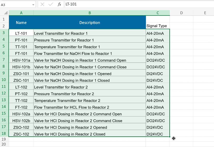 The conversion process involves Excel commands and functions to modify the content of the instrument IO list document, in order to meet thecolumn requirementsof the signal IO list.