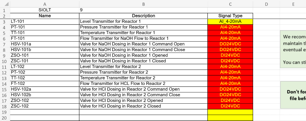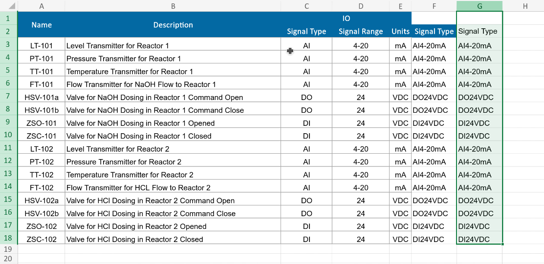 The information that corresponds with the requirements for "Signal Type" column from signal IO list is spread across 3 columns in the instrument IO list: "Signal Type", "Signal Range" and "Unit". These columns will be merged into one in order to meet the structure of the signal IO list.