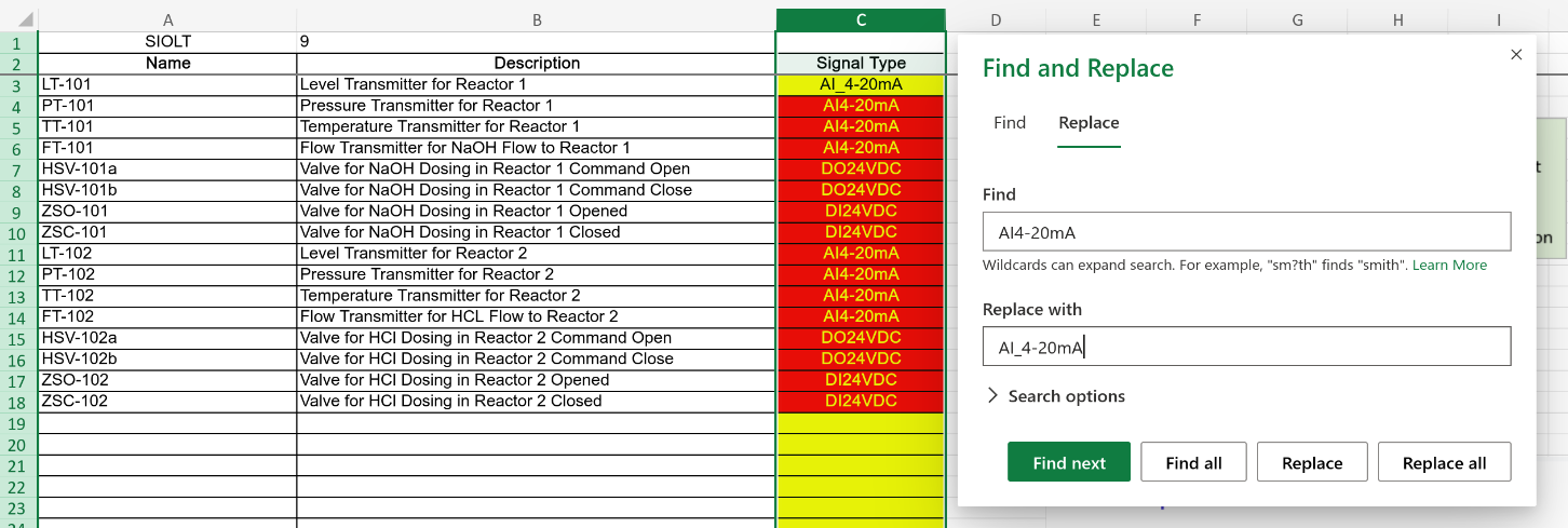 To replace the rest of the occurrences of the incorrect signal type "AI4-20mA", click on the title of "C" column to select the whole column and press Ctrl+H to open the "Find and Replace" dialog.
