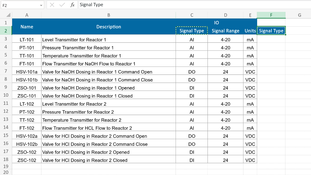 We can start with the modification of the instrument IO list document: open the Instrument-IO-List-Example.xlsx and remove all columns except "Tag", "Description", "Signal Type", "Signal Range" and "Units", as shown on Figure 2: