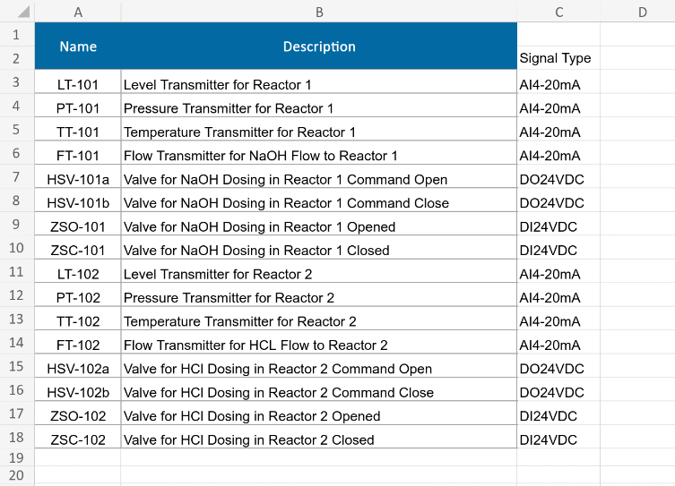 Please note that the method outlined above serves as asuggestedapproach. Users have the flexibility to use their own approaches for modifying the Excel file of the instrument IO list document into a signal IO list. The primary requirement is adherence to the specified column requirements.