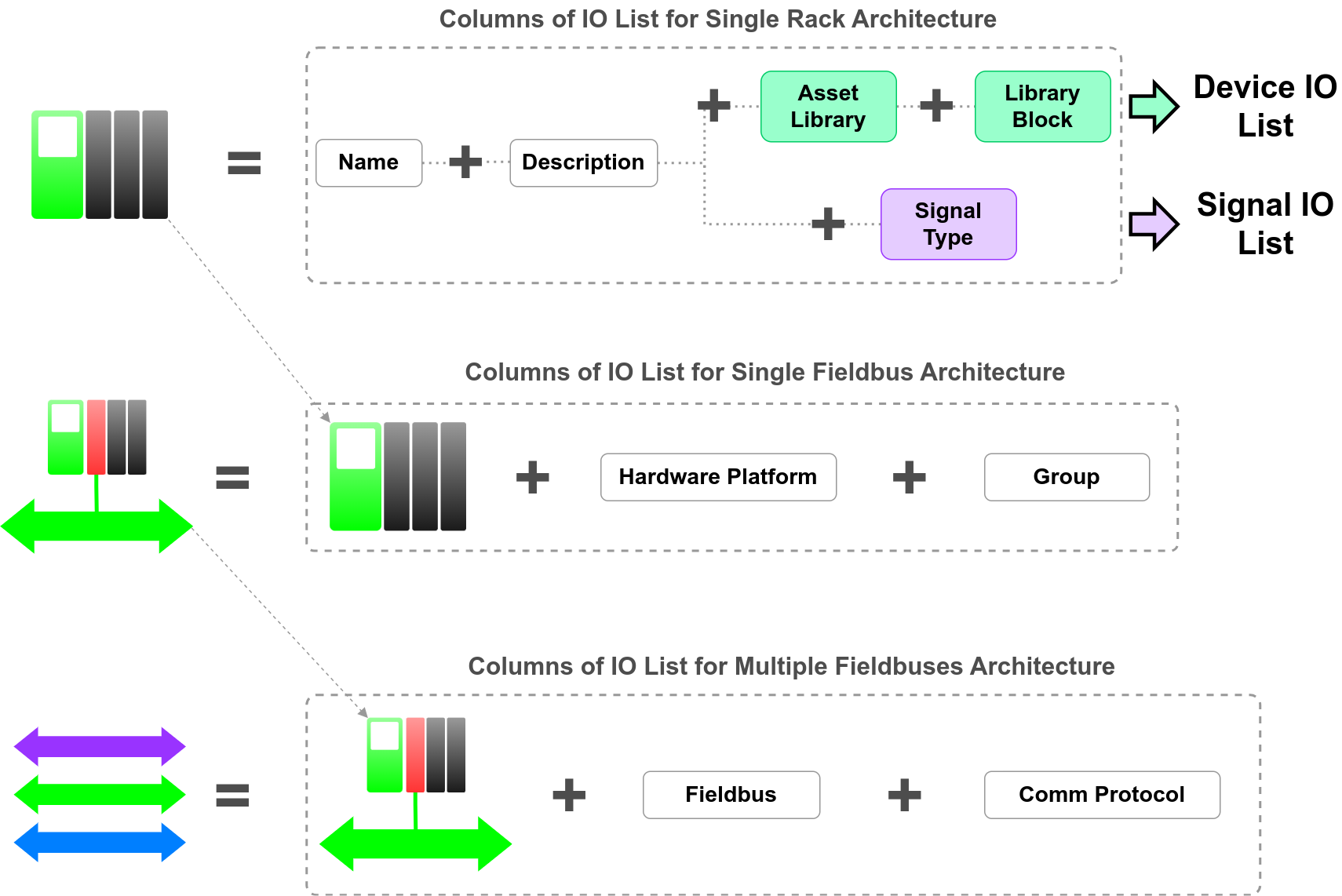 On Figure 9 is shown an overview of the IO list columns for all PLC architectures: